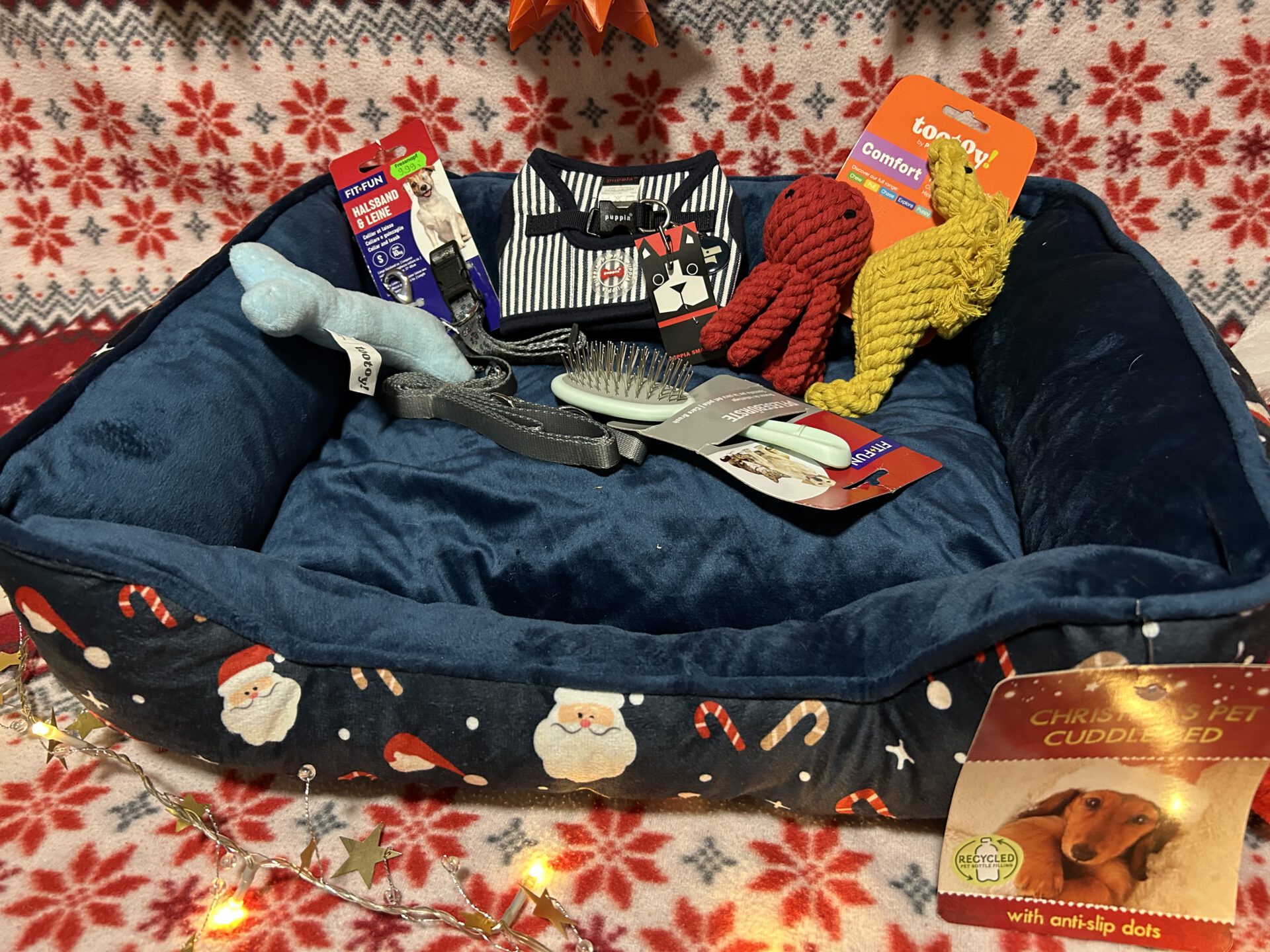 Ein wunderschönes Weihnachts-Kuschelbett mit einer Liegefläche von 30 x 40 cm, Außenmaß 45 x 55 cm. Das Bettchen ist waschbar.