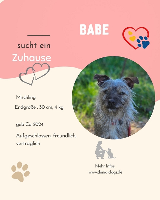 Babe ist eine kleine, süße Zuckerschnecke, die ihre Menschen mit ihrer freundlichen und offenen Art sicher sehr glücklich machen wird. Sie ist einfach nur lieb, aufgeschlossen und freut sich über jede Form von Zuwendung.