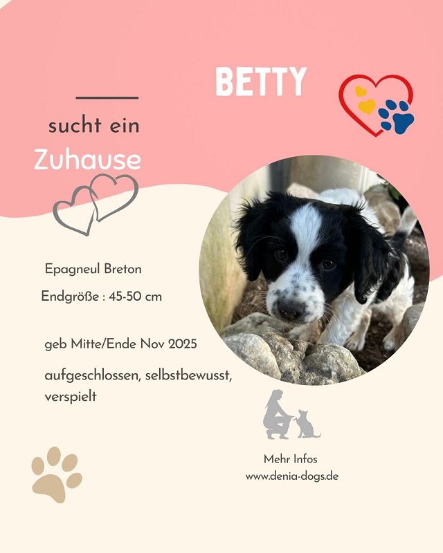 Jippeeeeeeeh – wem gehört die Welt? Natürlich mir, der kleinen, zauberhaften Betty auf Familien-Eroberungskurs! Ich wurde bei einem Jäger geboren und suche nun mein großes Glück in Form einer liebevollen Familie, die mich begleitet, fördert und mit mir durchs Leben geht.