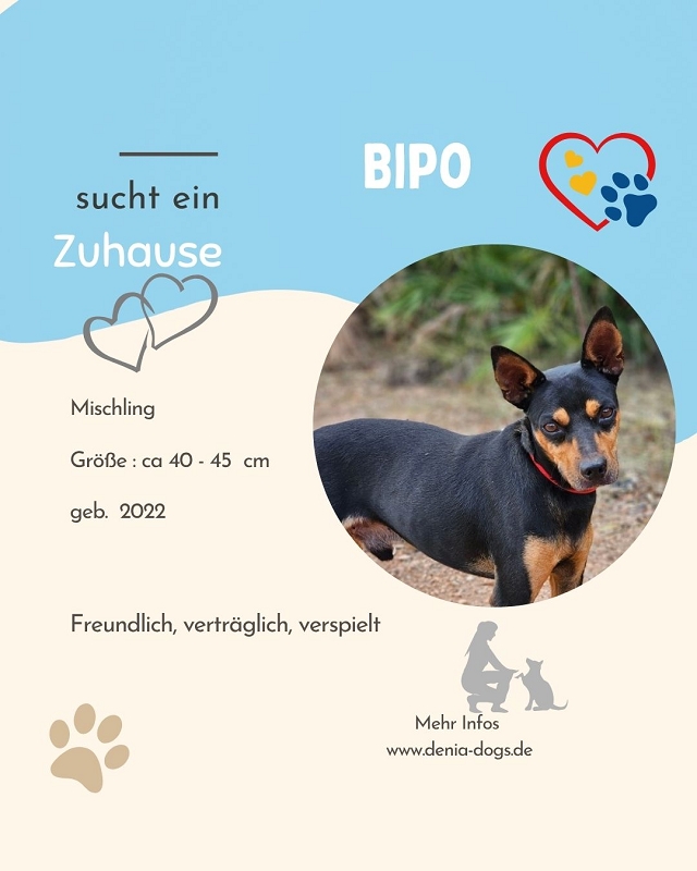 Bipo ist ein aufgeschlossenes Kerlchen, er geht gerne spazieren und erkundet seine Umwelt. Er wünscht sich Menschen die ebenso gerne unterwegs sind, ihn erziehen und beschäftigen. Bipo möchte etwas erleben und dann wird er auch gemütliche Stunden auf dem Sofa genießen.