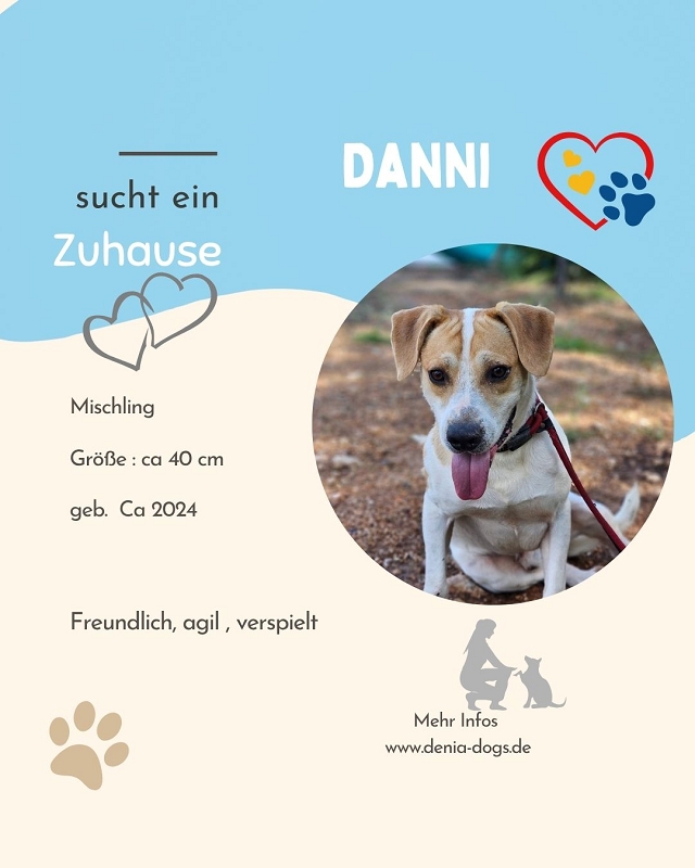 Danni ist ein typischer Junghund: agil, verspielt und immer dort, wo etwas los ist. Menschen findet er klasse, er ist freundlich und aufgeschlossen. Mit seinen Hundefreunden ist er verträglich und flitzt gerne mit ihnen durch den Auslauf.