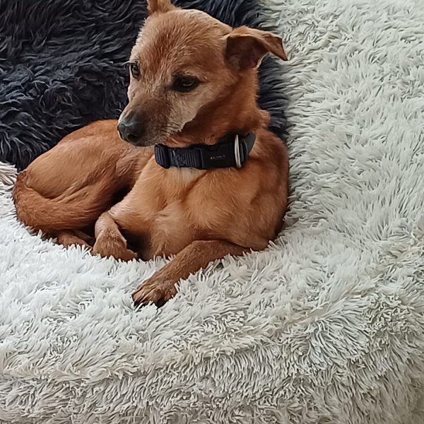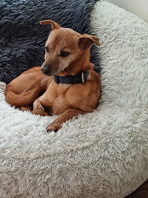 Er ist noch gut drauf und freut sich auf gemütliche Spaziergänge und lange Kuschelstunden auf der Couch.