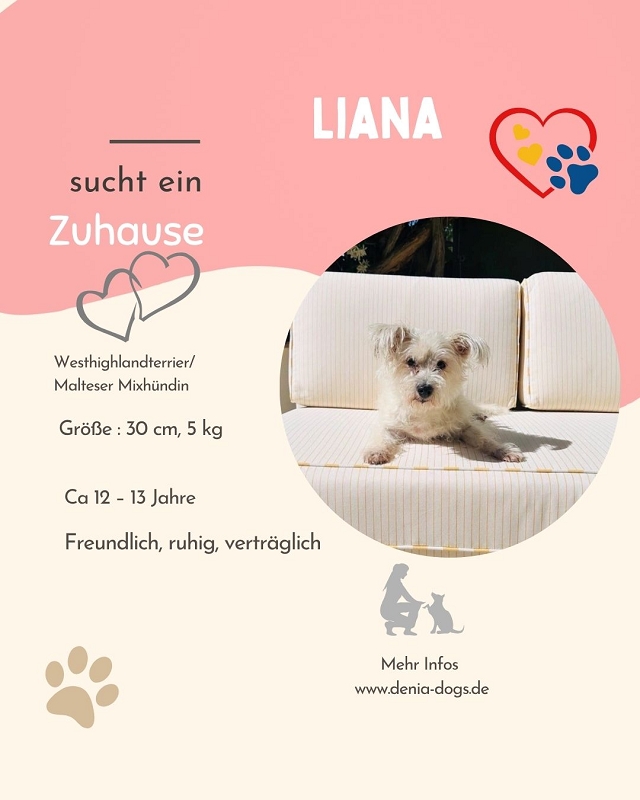 Für ihre Seniorenjahre wünscht sich Liana ein liebevolles Zuhause, in dem sie zur Ruhe kommen darf und man ihre sanfte, gelassene Art zu schätzen weiß. Sie liebt es gemütlich und genießt die Nähe zu ihren Menschen.