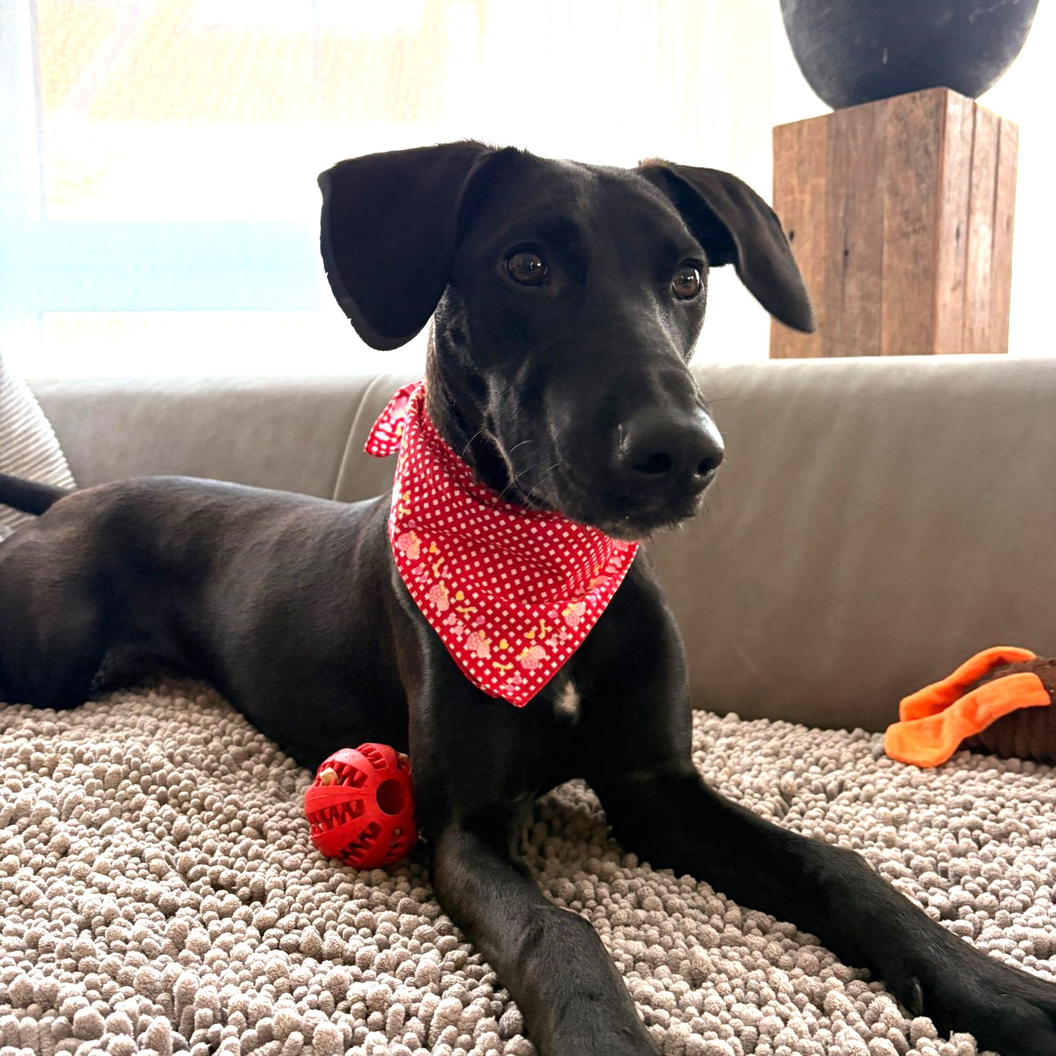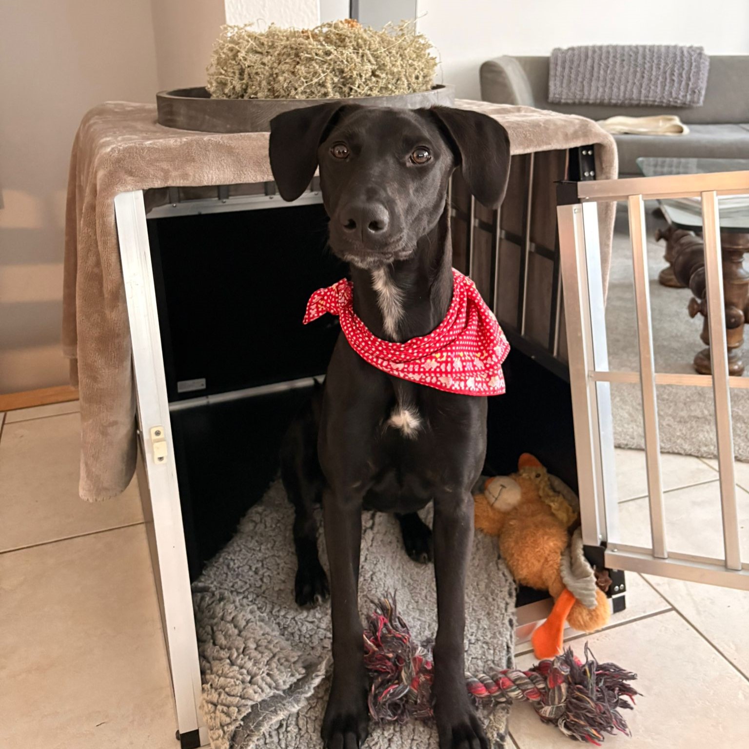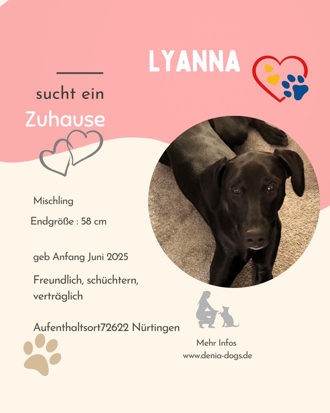 Lyanna kam mit ihren 6 Geschwisterchen in unsere Auffangstation. Die haben alle schon ein Zuhause gefunden, aber, für uns unverständlich, unsere süße Lyanna noch nicht. Der Mythos des großen, schwarzen Hundes? Finden wir auf gar keinen Fall, denn sie ist ein schwarzer Schatz – eine freundliche und aufgeschlossene Maus. Lyanna ist neugierig und interessiert. Bei Neuem und Unbekanntem ist sie zunächst vorsichtig, aber nicht ängstlich. Ansonsten ist sie schon viel selbstbewusster geworden. An der Leine laufen funktioniert schon sehr gut und Geschirr samt Mantel anziehen macht sie völlig problemlos mit. Wenn Gassigehen angesagt ist, steht sie in erster Reihe, gemeinsam mit Ihren 2 Mitbewohnerhündinnen, und freut sich darauf. Sie ist bewegungsfreudig und wäre z.B. sicherlich eine gute Joggingpartnerin. Bei Hundebegegnungen ist Lyanna durchweg freundlich, zu Katzenbegegnungen können wir noch nichts sagen. Sie war schon in der Hundeschule und ist dort eine Musterschülerin: Sitz und Platz kann sie schon und z.Zt. wird der Rückruf trainiert. Im Haus kommt die Süße gut zur Ruhe, ist schon an eine Hundebox gewöhnt und kann auch kurze Zeit alleine bleiben. Sie schläft nachts durch, ist stubenrein und meldet sich, wenn sie raus muss. Außerdem ist sie ein absoluter Kuschelhund. Allerdings verwechselt sie Schuhe noch mit Kauartikeln und deshalb wäre es ratsam, alles, was in diese Kategorie fallen könnte, unerreichbar für die Zuckerschute zu sichern. Lyanna sollte natürlich noch weiterhin das ABC des „Hundebenimm-Knigges“ lernen und entsprechend ihres Temperamentes körperlich und geistig beschäftigt werden.