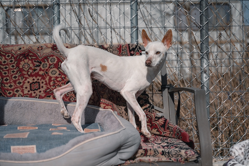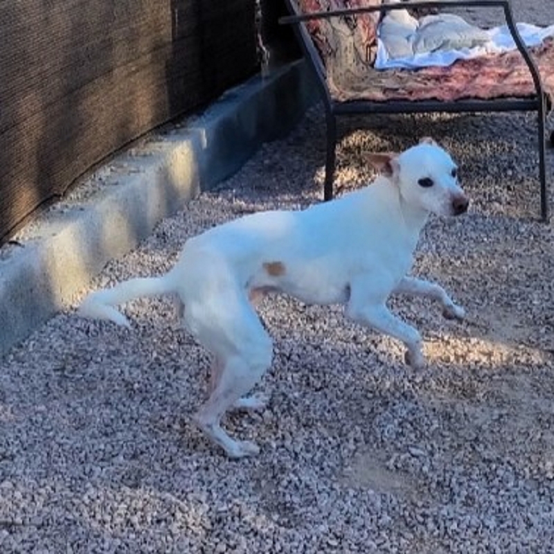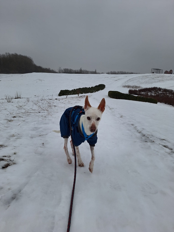 Snowy hat einen alten Bruch im vorderen Gelenk. Er ist schmerzfrei und im Alltag nicht eingeschränkt. Normale Spaziergänge, rennen und ausgeglichenes Spielen mit Artgenossen sind problemlos möglich. Lediglich sehr wildes Toben, Springen oder Bällchenholen sollten vermieden werden, um seine Gelenke langfristig zu schonen.