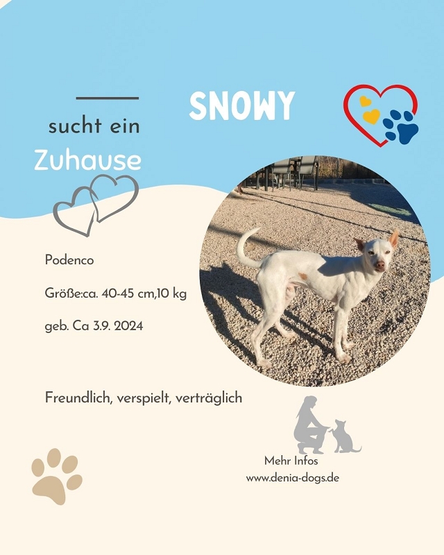Snowy sucht ein Zuhause, in dem er ankommen darf und Menschen, die seine freundliche Art zu schätzen wissen. Er bringt Freude, Wärme und ein großes Herz mit — und wird für seine Familie ein wunderbarer Begleiter sein.