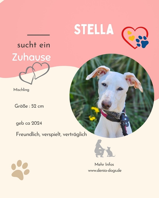 Aktuell lebt Stella in einer kleinen Auffangstation und zeigt sich dort als echtes Goldstück. Sie liebt Menschen über alles, sucht Nähe, genießt Streicheleinheiten und begegnet jedem freundlich und offen. Altersgemäß ist sie verspielt, neugierig und voller Lust auf Abenteuer. Auch mit anderen Hunden ist sie absolut unkompliziert und sehr verträglich.