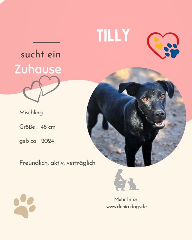Unsere Tilly ist eine wundervolle Junghündin, die mit ihrem glänzend schwarzen Fell sofort ins Auge fällt. Sie ist sehr freundlich und geht offen auf jeden zu. Menschen liebt sie über alles, und auch mit anderen Hunden ist sie durchweg verträglich. Tilly ist agil und benötigt altersgerecht viel Bewegung sowie viele Abenteuer.