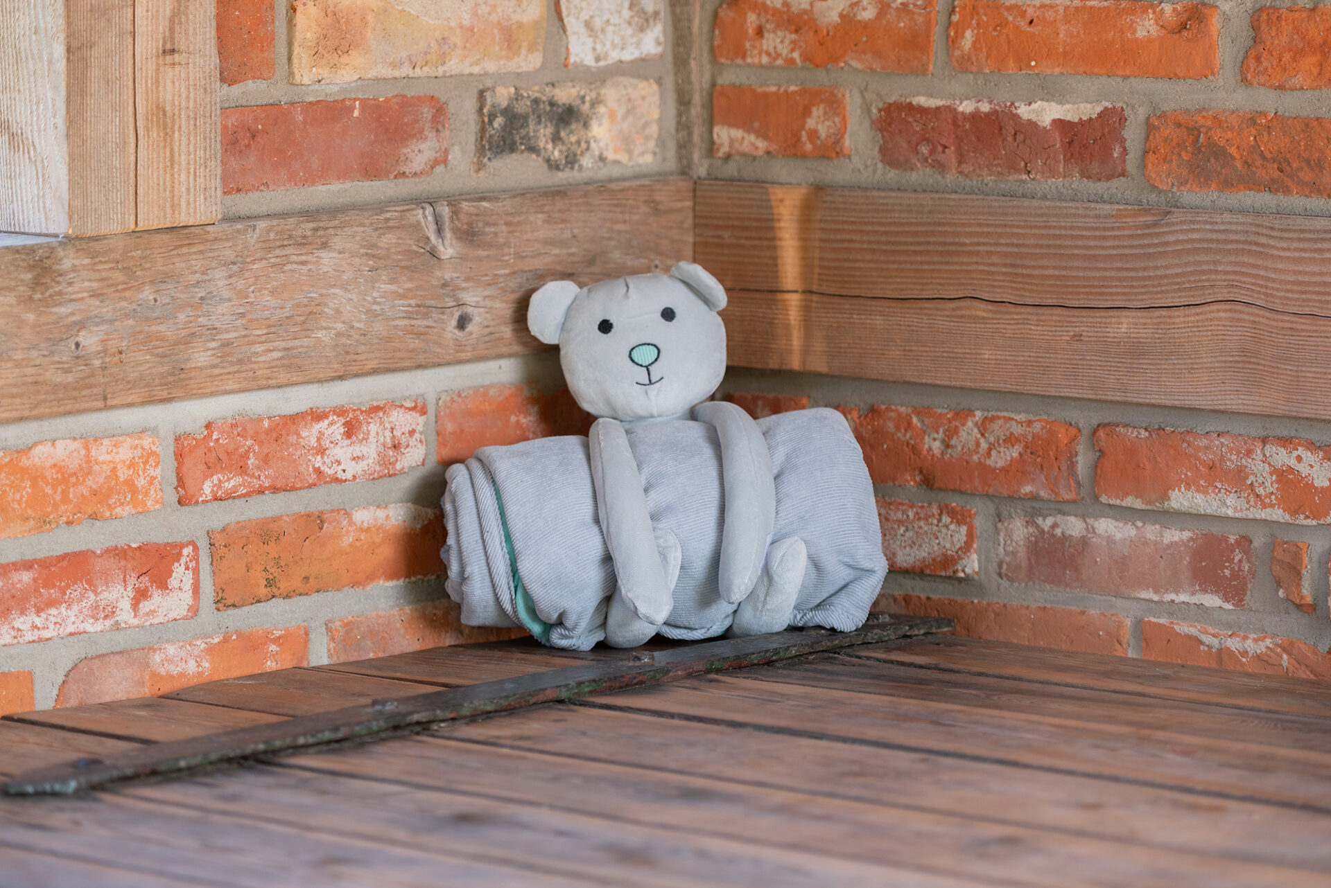 Neuwertige Decke aus Cordstoff mit Teddy in grau/türkis